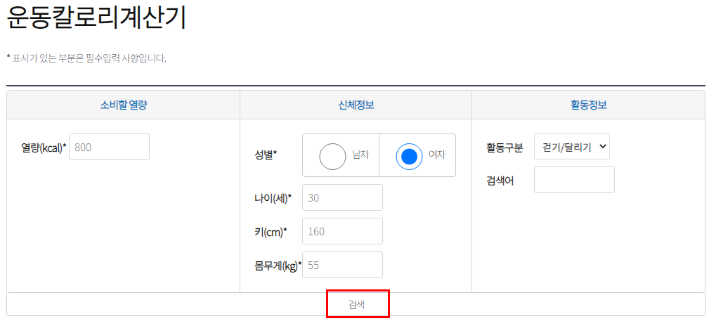 식품안전나라 홈페이지에서 > 건강영양 카테고리> BMI계산기 /운동 칼로리 계산기/칼로리 사전을 확인할 수 있습니다.