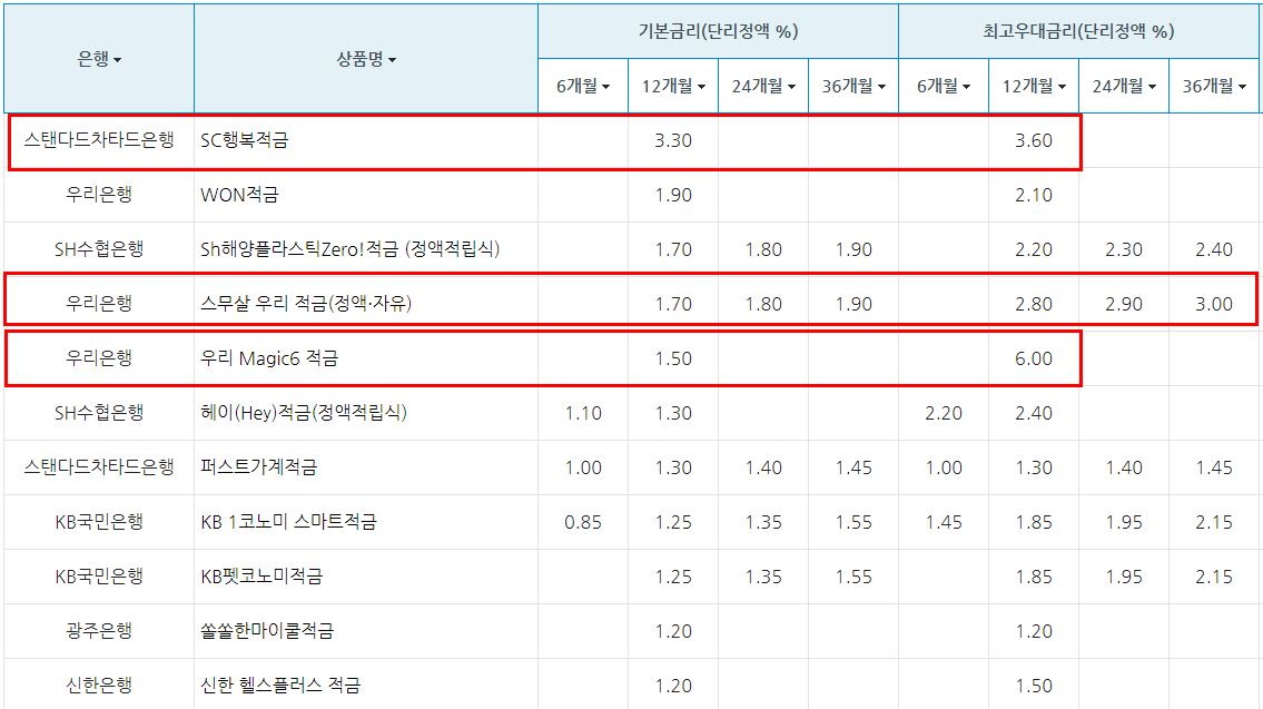 제일은행 SC행복적금이 12개월만기 최고 우대금리가 3.6%로 높은 편이에요. 우대이율을 지급 받기 위해서는 그만큼의 조건을 충족해야 한다는 단점도 있습니다.